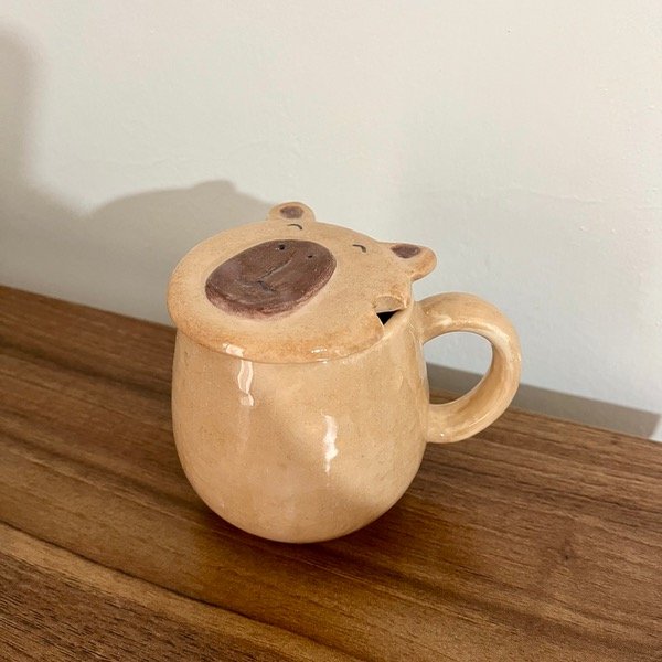 Taza lisa con tapa en forma de capibara. (Con el detalle del hueco para cuchara)